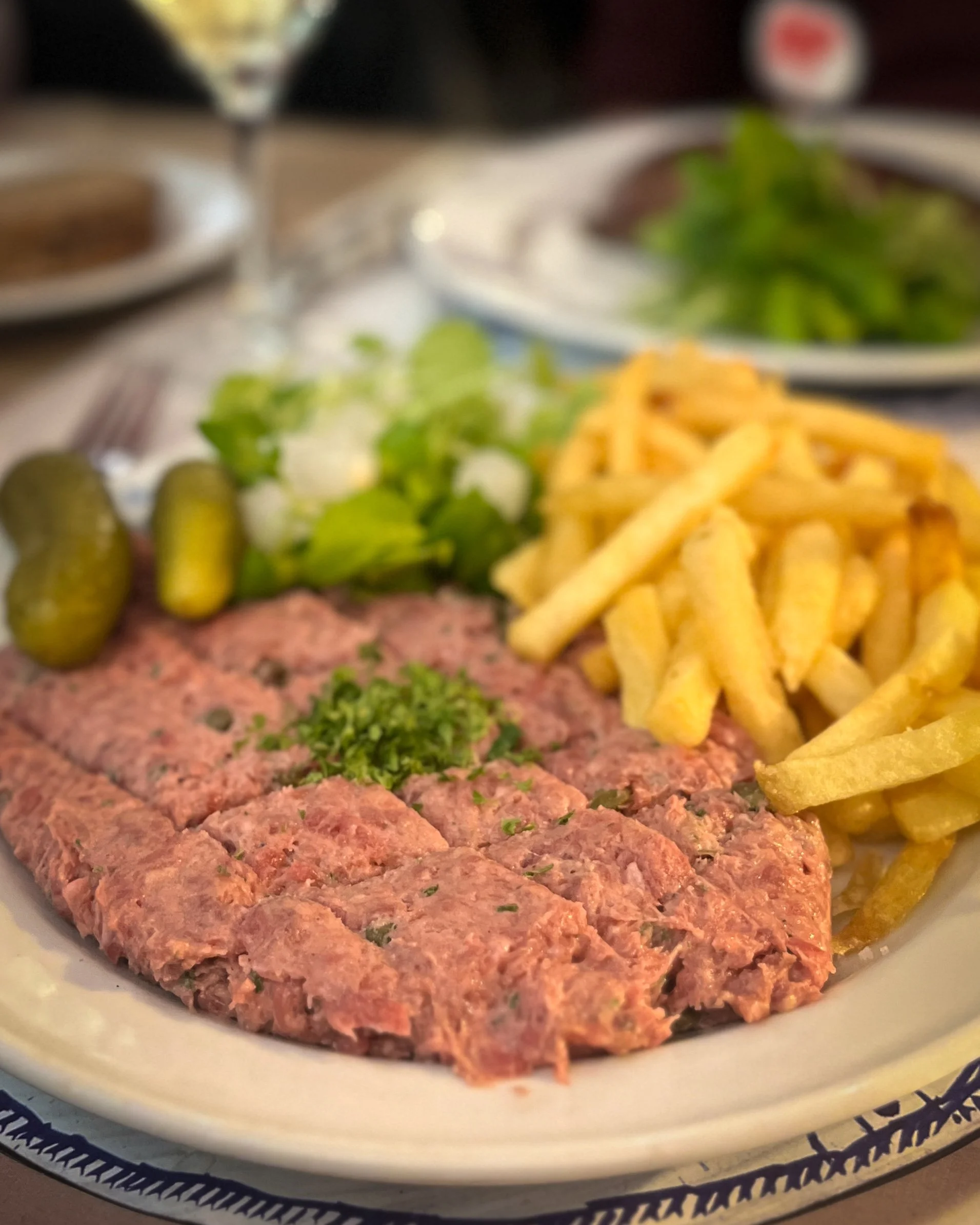 I’ve had many since living in Brussels. This one is easily among the top ones I’ve eaten. Nicely seasoned, smooth texture without being overworked. Slight acidity with the capers mixed in and a touch of sweetness when you had a bite of the dill pickle on the side. It was perfect, actually. It was served with thin crispy fries and homemade mayonnaise.