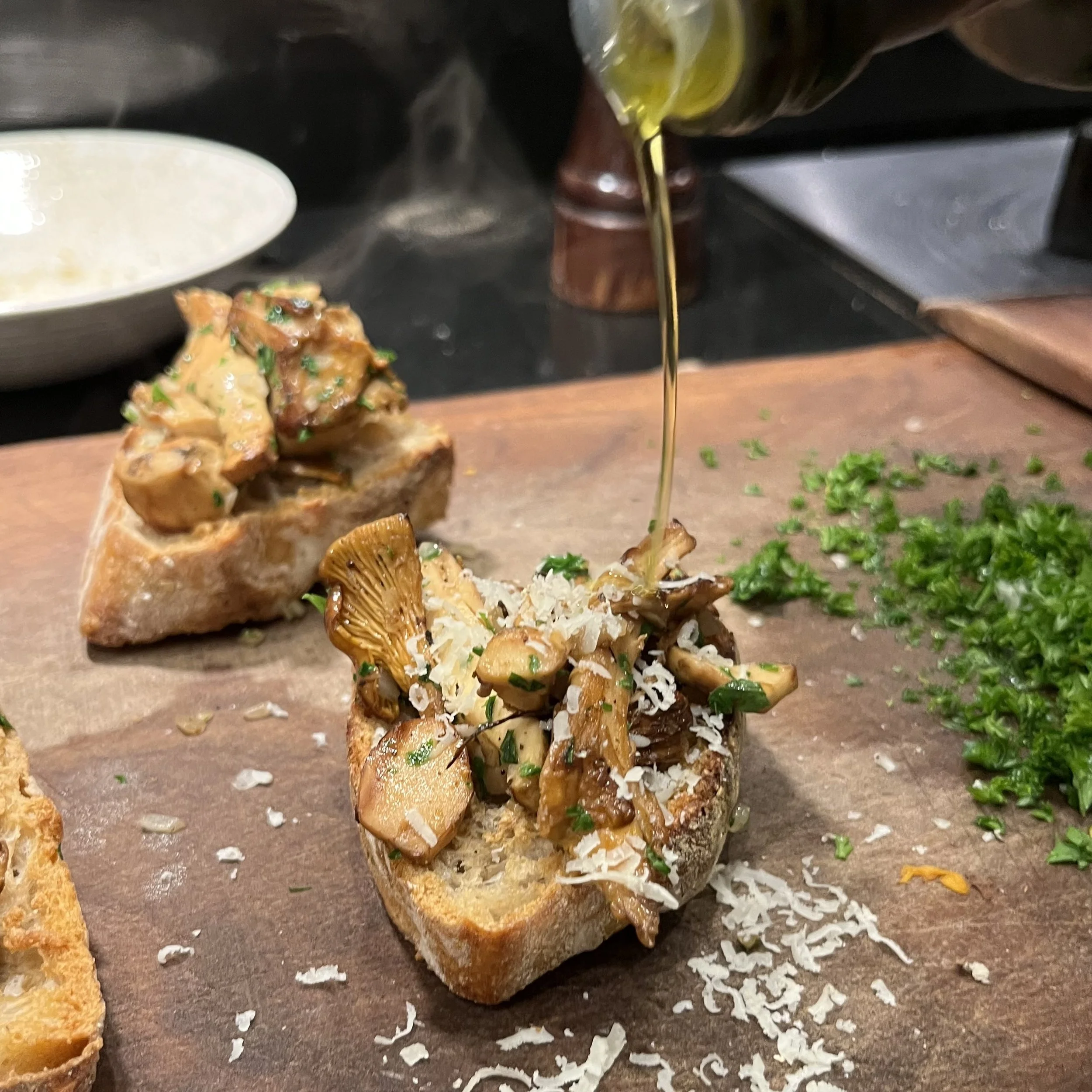 1. Heat it up: Get your pan piping hot! Start with olive oil, not butter, as butter can easily burn. Add your mushrooms immediately after the oil is in the hot pan to prevent the oil from burning. The butter will come into play later.