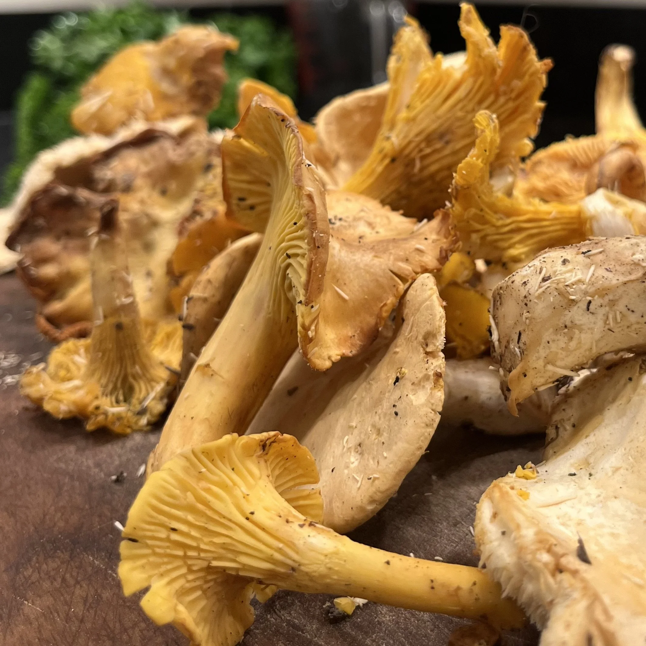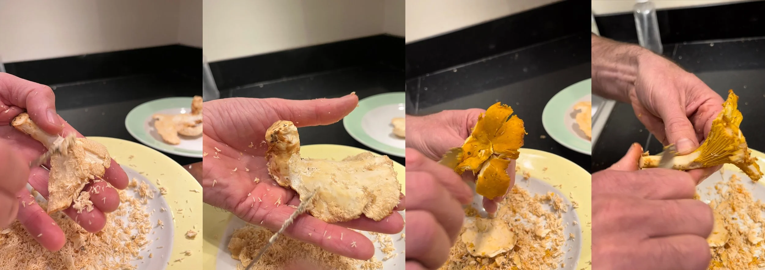 To clean them, use the back of a small kitchen knife to scrape off the dirt. The Pied de Moutons have a flaky underside that can be removed entirely, making them quite easy to clean. The Chanterelles need a little more attention under the mushroom tops, as dirt can get trapped between the ridges.
