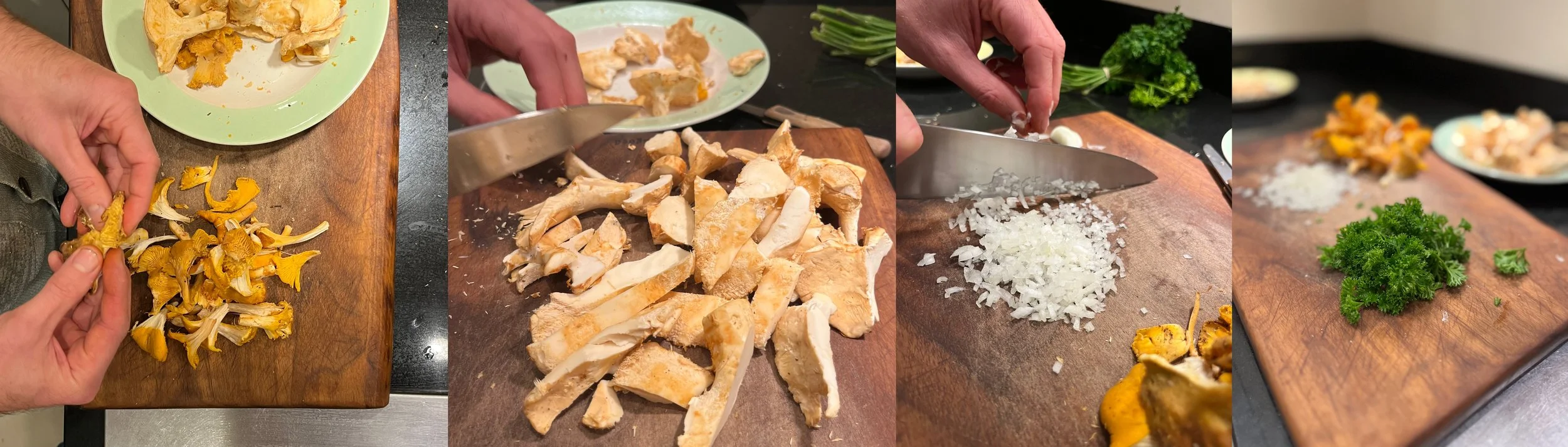 Once your mushrooms are clean, tear apart the Chanterelles and cut the Pied de Moutons with a knife. This doesn't require precision; you just want to aim for roughly the same size.